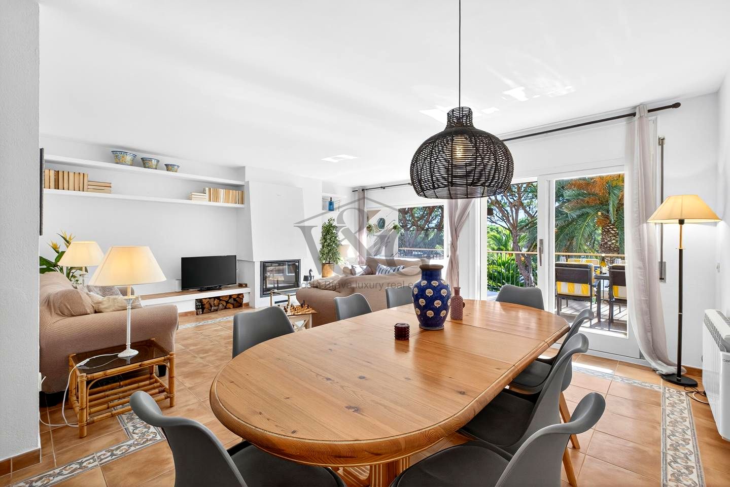 En la planta principal encontramos un elegante recibidor que da acceso a un amplio y luminoso salón-comedor con chimenea, con salida a una agradable terraza con vistas a la zona comunitaria, ideal para disfrutar de comidas o momentos de relax al aire libre con familia y amigos.