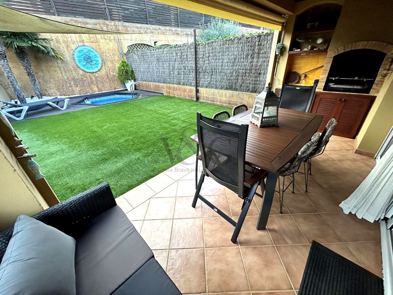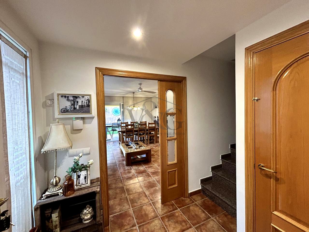 Un elegante recibidor nos da la bienvenida y nos conduce a un amplio salón-comedor con chimenea, muy luminoso, y con salida directa a un encantador porche de verano con barbacoa. Desde allí accedemos al bonito jardín con piscina privada, un espacio ideal para relajarse y disfrutar con familia y amigos.
