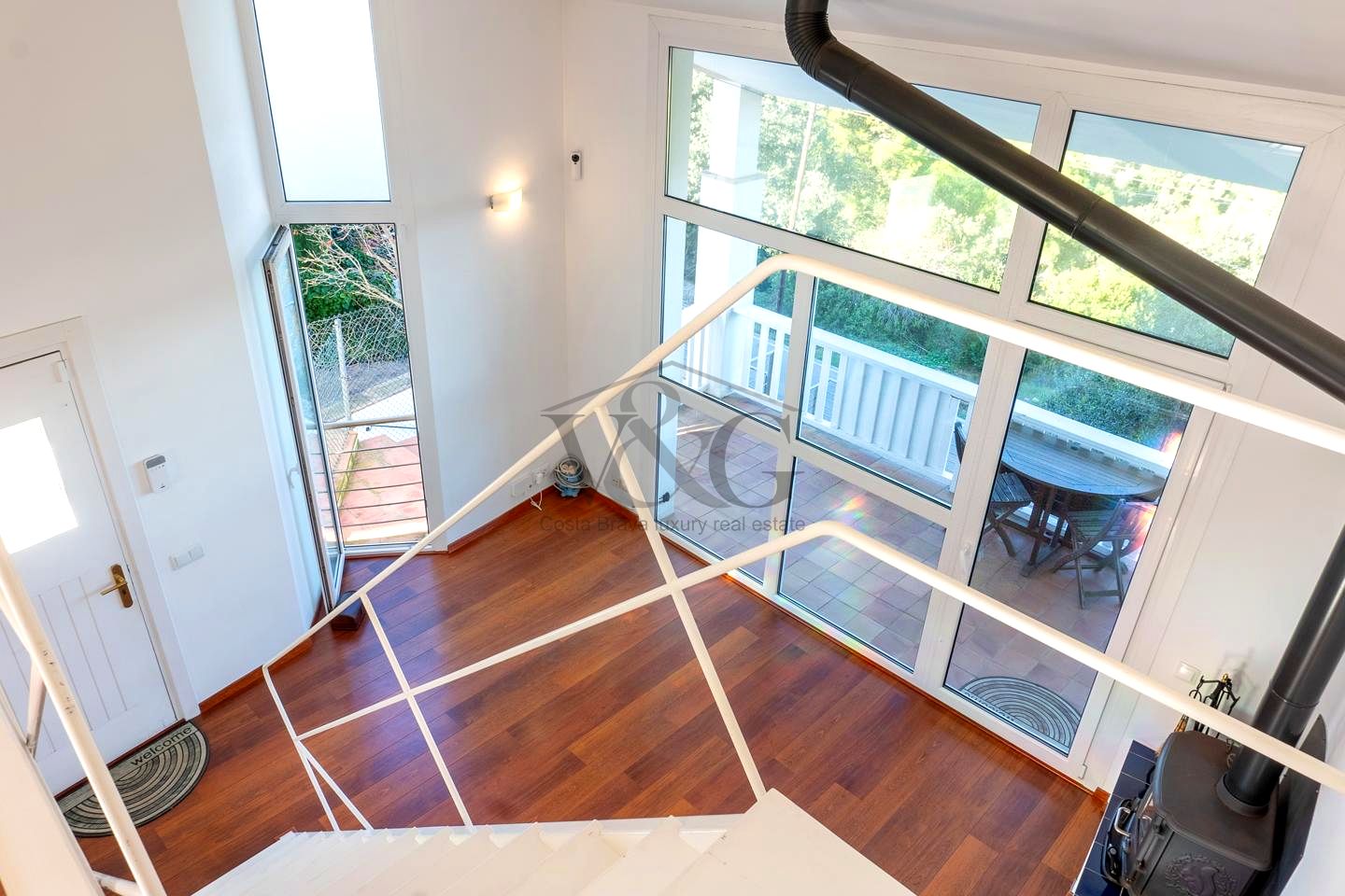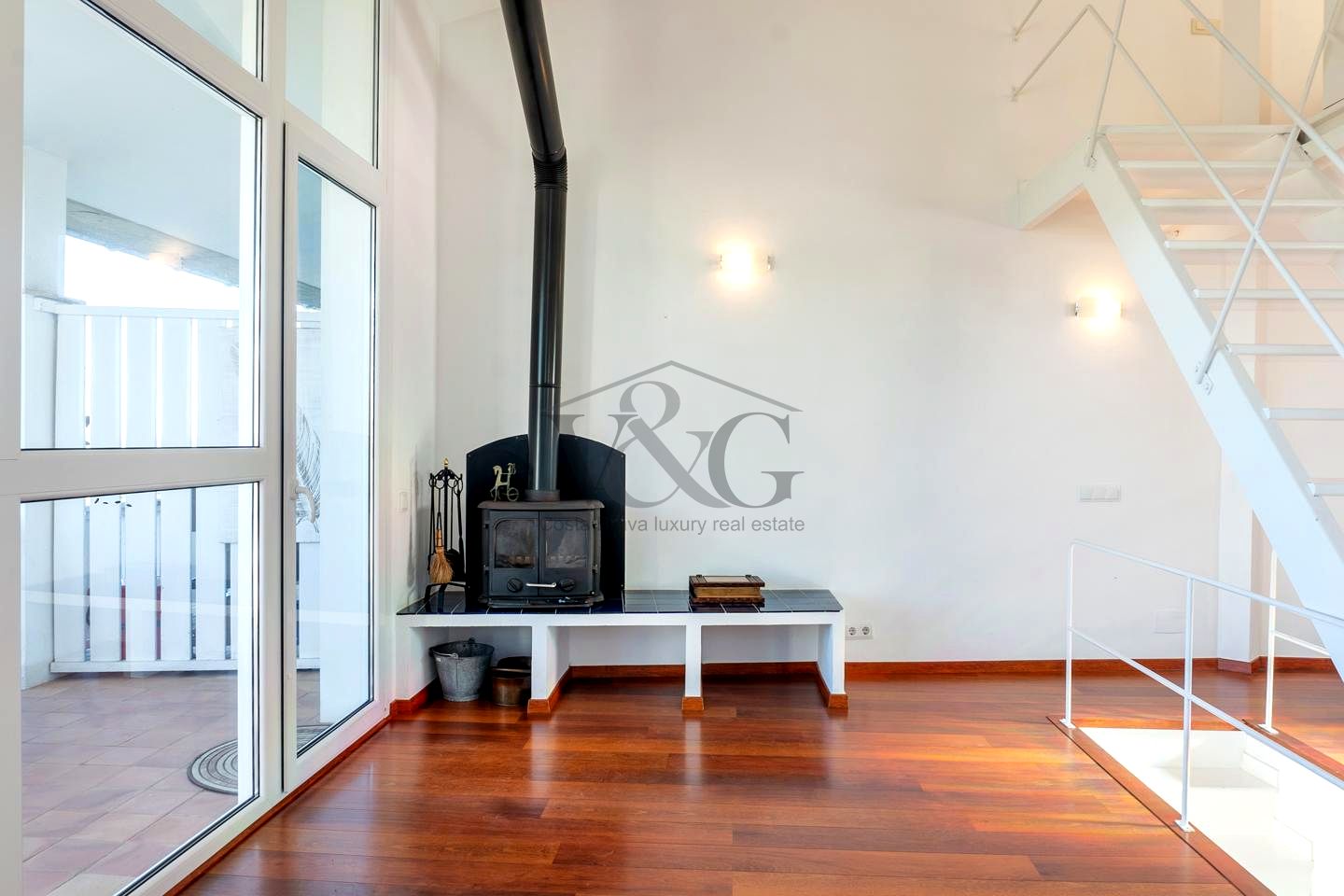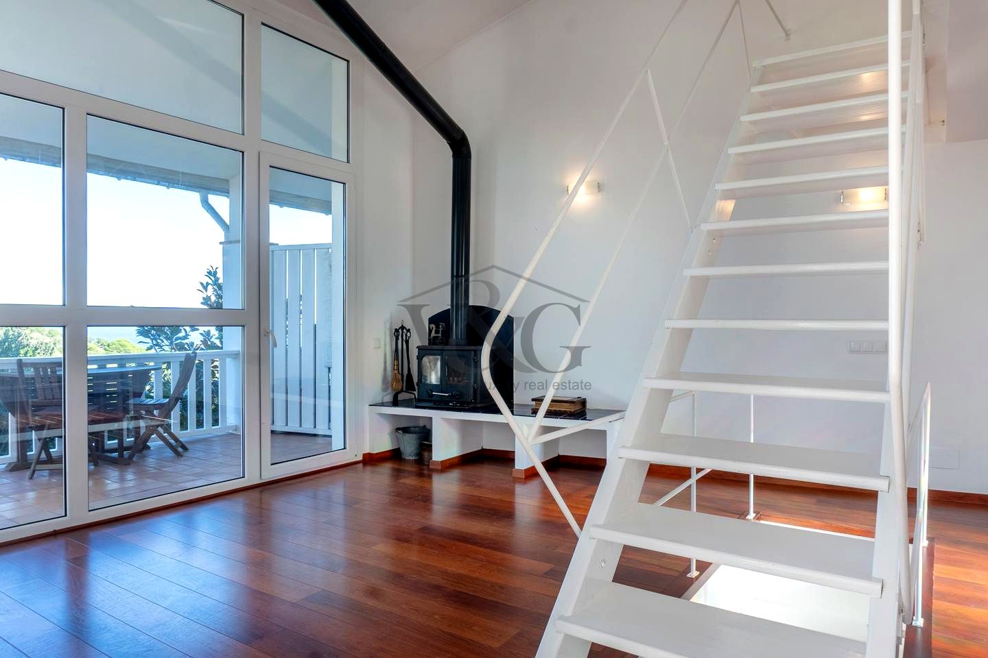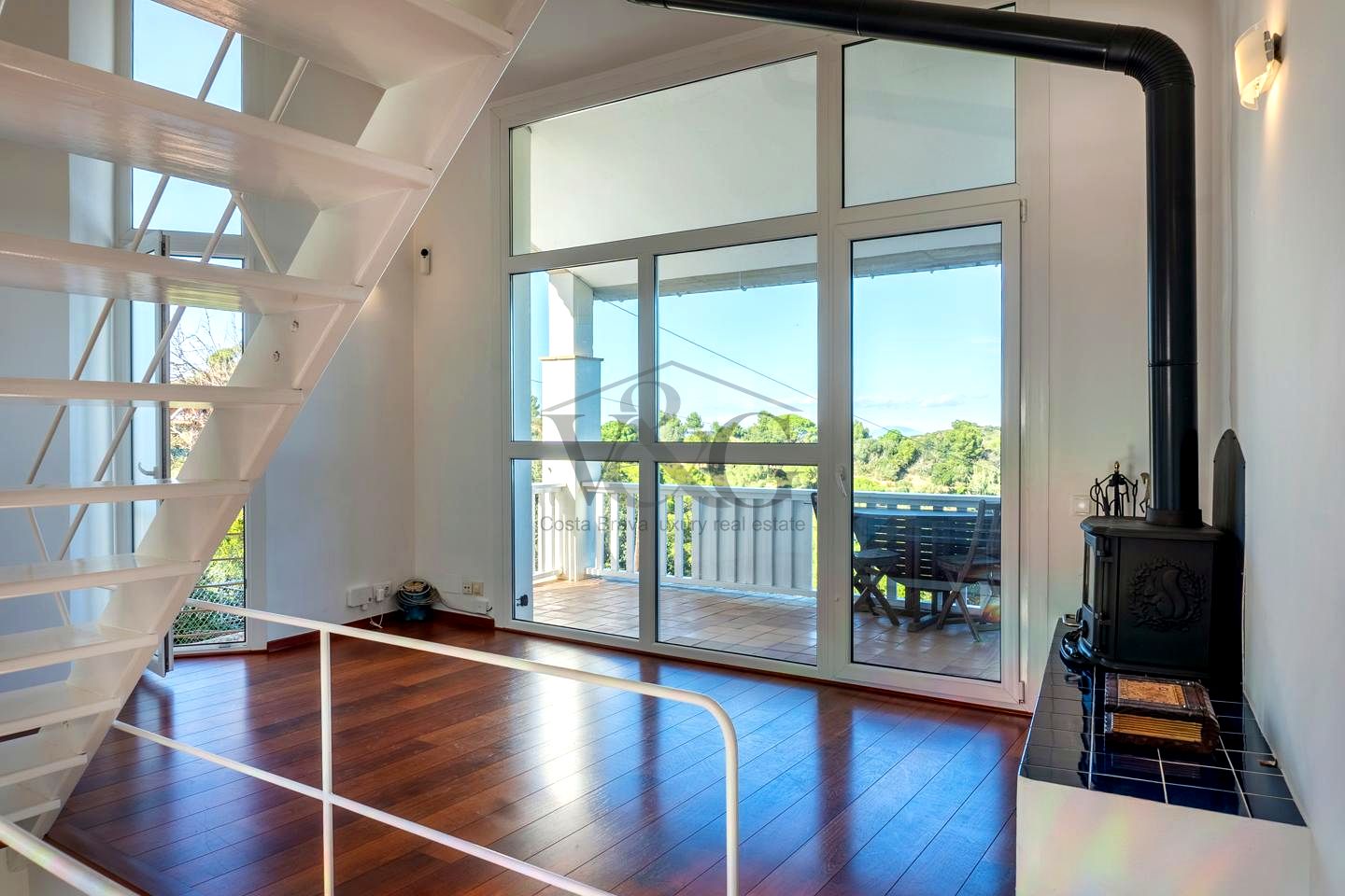 Gran salón con chimenea cerrada y enormes ventanales