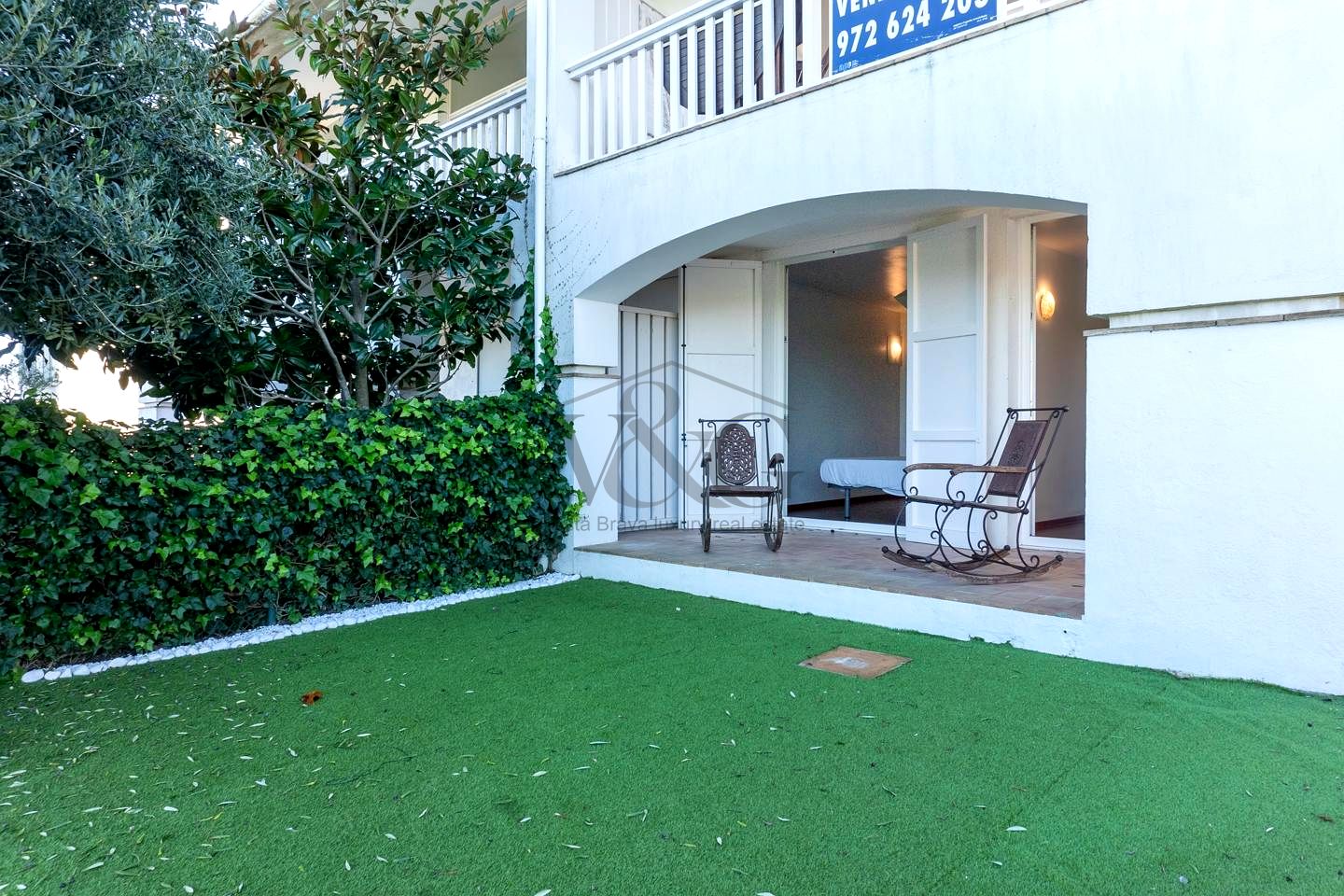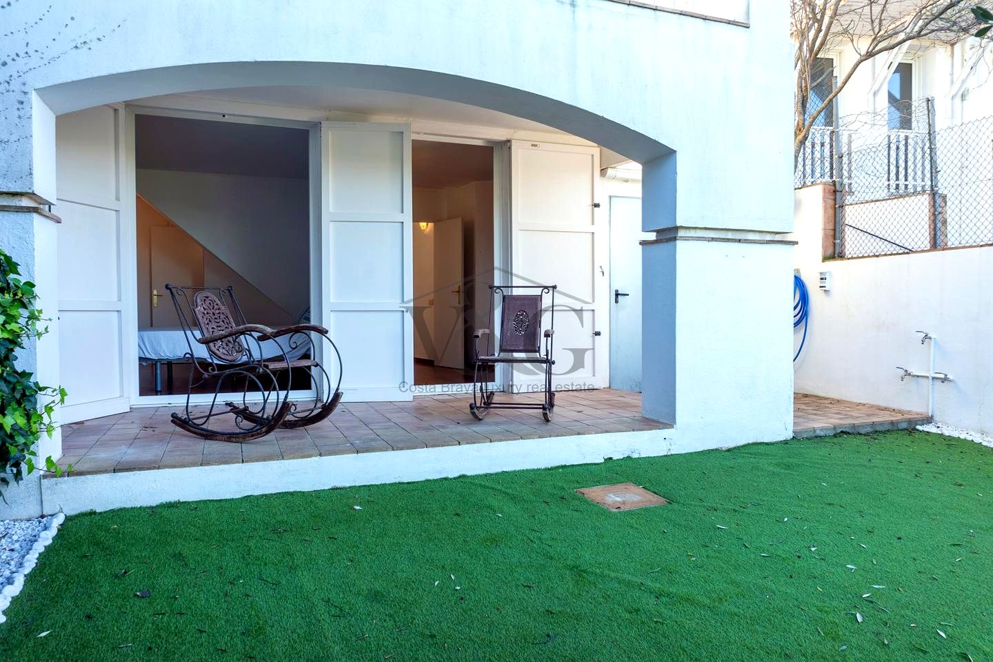 Jardín privado muy fácil de mantener: césped artificial, riego automático, árboles, zona de estar y trastero exterior